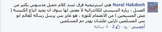 وشارك أحد رواد “فيس بوك” قائلًا: “هي إستراتيجية فرق تسد كلام جميل مدسوس بكثير من العسل، زيارة السيسي للكاتدرائية لا معنى لها سوى أن يحيد أتباع الكنيسة (مش المسيحيين) من الانضمام للثورة، هو عايز بس يرسل رسالة للعالم انو بس المسلمين نازلين علشان يهدر دم المسلمين”.
