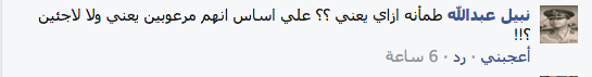 وقال نبيل عبدالله: “طمأنة ازاي يعني؟ على أساس انهم مرعوبين يعني ولا لاجئين؟!”.
