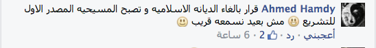 وسخر حامد حمدي قائلًا: “قرار بإلغاء الديانة الإسلامية وتصبح المسيحية المصدر الأول للتشريع، مش بعيد نسمعه قريب”.