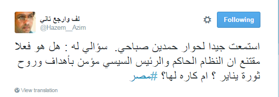 وقال- عبر تغريدة له على “تويتر”- “استمعت جيدا لحوار حمدين صباحي”، سؤالي له : هل هو فعلاً مقتنعاً ان النظام الحاكم والرئيس السيسي – على حد وصفه- مؤمن بأهداف وروح ثورة يناير ؟ أم كاره لها؟”.