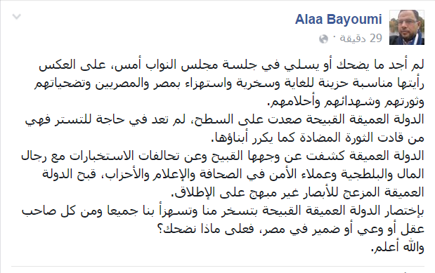 قال الباحث السياسي علاء بيومي، إن أولى جلسات البرلمان المصري، أمس، كانت بمثابة سخرية واستهزاء بمصر والمصريين وتضحياتهم وثورتهم وشهدائهم وأحلامهم، مشيرًا إلى أنها كانت حزينة وليس فيها ما يضحك أو يسلي.