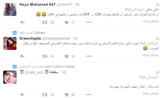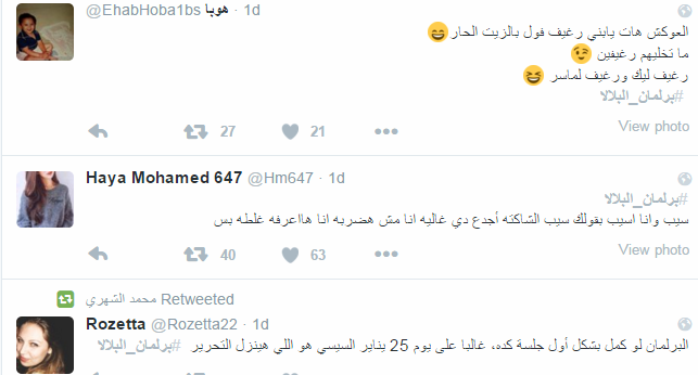 وشهد الهاشتاج مشاركة كبيرة بمجرد تدشينه، وعكست معظم التعليقات عبر الهاشتاج ساخرة من أداء ومستوى البرلمان، ومن بين التعليقات، ما يلي: