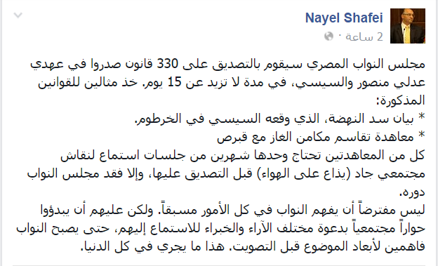 وضرب -عبر منشور له على “فيس بوك”- مثالين للقوانين المذكورة؛ بيان سد النهضة، الذي وقعه السيسي في الخرطوم، ومعاهدة تقاسم مكامن الغاز مع قبرص.