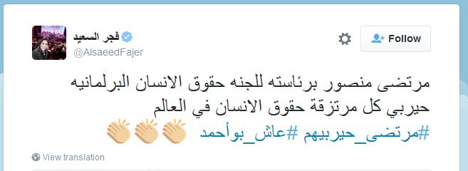 رحبت الكاتبة الكويتية فجر السعيد بتولي المستشار مرتضى منصور عضو مجلس النواب، رئاسة لجنة حقوق الإنسان بالمجلس، وذلك من خلال حسابها الشخصي بموقع التغريدات القصيرة “تويتر”.
