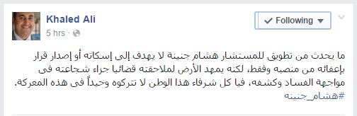 وقال “علي” خلال حسابه الشخصي بموقع التواصل الاجتماعي “فيس بوك”: “ما يحدث من تطويق للمستشار هشام جنينة لا يهدف إلى إسكاته أو إصدار قرار بإعفائه من منصبه وفقط، لكنه يمهد الأرض لملاحقته قضائيا جزاء شجاعته في مواجهة الفساد وكشفه، فيا كل شرفاء هذا الوطن لا تتركوه وحيدا في هذه المعركة”.