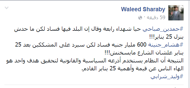 جاء ذلك في منشور كتبه “شرابي” على حسابه في موقع “فيس بوك”، قال فيه: “حمدين صباحي حيا شهداء رابعة وقال إن البلد فيها فساد لكن ما حدش ينزل 25 يناير!! وهشام جنينة يقول 600 مليار جنيه فساد لكنه سيرد على المشككين بعد 25 يناير عشان الشارع ما يسخنش”.