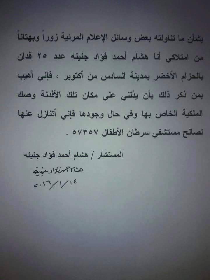 وأوضح جنينة في إقراره المذيل بتوقيعه: “إني أهيب بمن يذكر ذلك بأن يدلني على مكان تلك الأفدنة وصك الملكية الخاصة بها”، وأضاف “وفي حالة وجودها فإني أتنازل عنها لصالح مستشفى سرطان الأطفال 57357”.