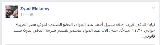 وكتب “العليمي” عبر حسابه على موقع التواصل الاجتماعي “فيس بوك”: “نيابة الدقي قررت إخلاء سبيل أحمد عبد الجواد، العضو المنتدب لموقع مصر العربية حوالي ١١.٣٠ صباحًا. حتى الآن عبد الجواد محتجز بقسم شرطة الدقي بدون سند قانوني”.