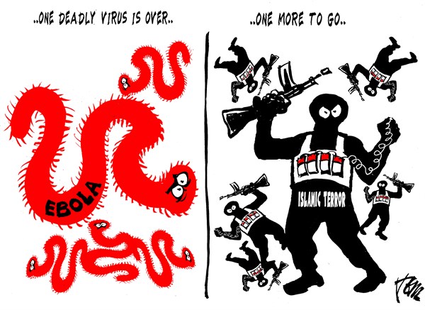 وقدم موقع “بولتيكال كارتونز” هذا الرسم ساخرا من تنظيم الدولة وفيرس الإيبولا: