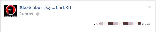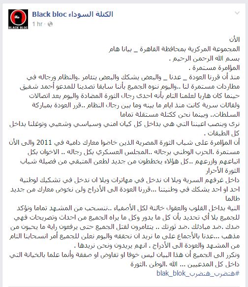 أعلنت مجموعة البلاك بلوك (الكتلة السوداء) انسحابها بشكل نهائي من المشهد السياسي المصري، وذلك في بيان أصدرته على صفحتها الرسمية بموقع التواصل الاجتماعي “فيس بوك”.