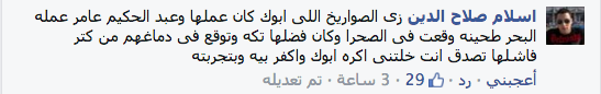 وعلق “إسلام صلاح الدين” قائلًا: “زي الصواريخ اللي أبوك كان عملها وعبد الحكيم عامر عمله البحر طحينة وقعت في الصحرا وكان فضلها تكة وتوقع في دماغهم من كتر فاشلها تصدق انت خلتني أكره أبوك وأكفر بيه وبتجربته”.