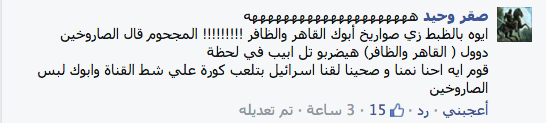 وسخر حساب “صقر وحيد” قائلا: “ايوه بالظبط زي صواريخ أبوك القاهر والظافر !!!!!!!!! المجحوم قال الصاروخين دوول (القاهر والظافر) هيضربو تل أبيب في لحظة، قوم ايه احنا نمنا وصحينا لقنا إسرائيل بتلعب كورة على شط القناة وأبوك لبس الصاروخين”.