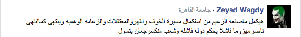 وقال “زياد وجدي”: “هيكمل ما صنعه الزعيم من استكمال مسيرة الخوف والقهر والمعتقلات والزعامة الوهمية وينتهي كما انتهى ناصر مهزوما فاشلا يحكم دولة فاشلة وشعب منكسر جعان يتسول”.