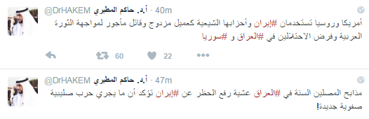 وقال “المطيري” في تغريدة له على “تويتر”: “مذابح المصلين السنة في العراق عشية رفع الحظر عن إيران تؤكد أن ما يجري حرب صليبية صفوية جديدة”.