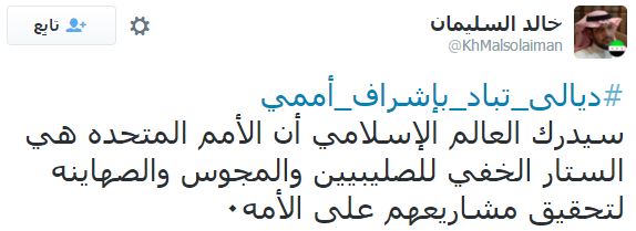 وعلق خالد السليمان قائلًا: “سيدرك العالم الإسلامي أن الأمم المتحدة هي الستار الخفي للصليبيين”،