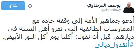 وطالب يوسف القرضاوي، رئيس الاتحاد العالمي لعلماء المسلمين، جماهير الأمة إلى وقفة جادة مع الممارسات الطائفية التي تغزو أهل السنة في ديارهم،
