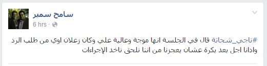 وأكد “سمير” عبر حسابه الشخصي بموقع التواصل الاجتماعي “فيس بوك”، أن ناجي شحاتة أصابه حزن شديد فور علمه بطلب الرد قائلا: “دي موجة وعالية علي”.