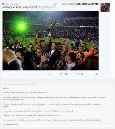 أبدى الإسباني خوان كارلوس جاريدو، المدير الفني السابق للنادي الأهلي، حزنه الشديد على رحيل البرتغالي جوزيه بيسيرو، المدير الفني للقلعة الحمراء.