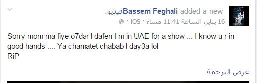 وعلق، قائلا: “Sorry mom ma fiye o7dar l dafen I m in UAE for a show … I know u r in good hands… Ya chamatet chabab l day3a lol”.