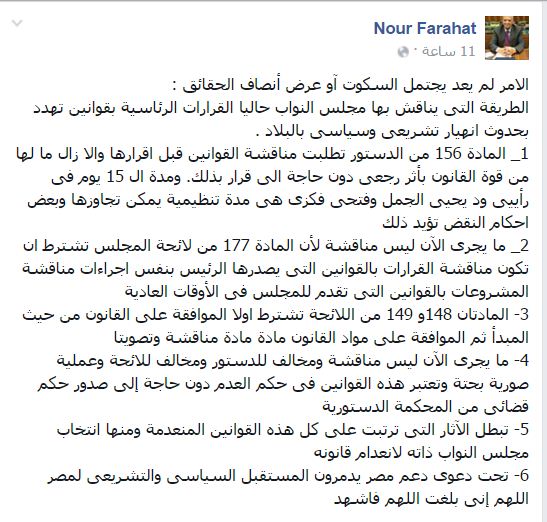 وأوضح “فرحات”، في منشور له على حسابه في موقع “فيس بوك”، خطر ذلك في عدة نقاط؛ أولها أن “المادة 156 من الدستور تطلبت مناقشة القوانين قبل إقرارها وإلا زال ما لها من قوة القانون بأثر رجعي دون حاجة إلى قرار بذلك، ومدة الـ15 يومًا في رأيي والدكتور يحيى الجمل، وفتحي فكري، هي مدة تنظيمية يمكن تجاوزها وبعض أحكام النقض تؤيد ذلك”.