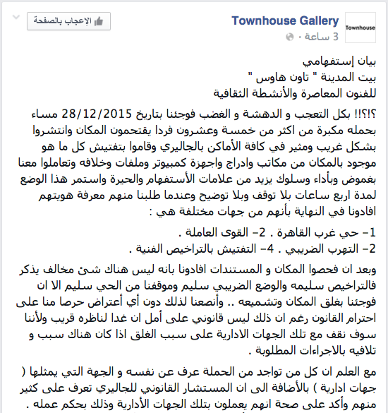 وقال البيان الصادر عن البيت: “بكل التعجب والدهشة والغضب فوجئنا بتاريخ 28/12/2015 مساء بحملة مكبرة من أكثر من خمسة وعشرين فردا يقتحمون المكان وانتشروا بشكل غريب ومثير في كل الأماكن بالجاليري وقاموا بتفتيش كل ما هو موجود بالمكان من مكاتب وأدراج وأجهزة كمبيوتر وملفات وخلافه، وتعاملوا معنا بغموض وبأداء وسلوك يزيد من علامات الاستفهام والحيرة، واستمر هذا الوضع لمدة أربع ساعات بلا توقف وبلا توضيح، وعندما طلبنا منهم معرفة هويتهم أفادونا في النهاية بأنهم من جهات مختلفة هي: 1- حي غرب القاهرة 2- القوى العاملة 3- التهرب الضريبي 4- التفتيش بالتراخيص الفنية.