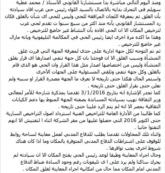 وأفاد: “إنه منذ اليوم التالي مباشرة بدأ مستشارنا القانوني الأستاذ / محمد عطية سويلم في التحرك بداية بالاتصال بالسيد اللواء رئيس حي غرب أفاد سيادته بأن الغلق تم بمعرفة اللجان المرافقة للحي وليس للحي أي شأن بالغلق فكان رد المستشار القانوني بأنه منذ أكثر من سبع سنوات تقدم لحي غرب لترخيص المكان إلا أن الحي أفاده بأن النشاط غير خاضع للترخيص، وهذا ما أكده مرة أخرى أيضا رئيس الحي في المكالمة الهاتفية وأنه ما زال غير خاضع للترخيص”.