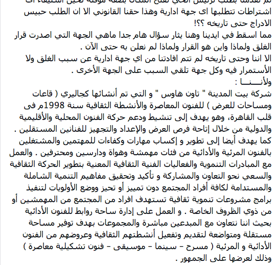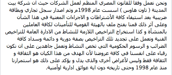 واختتم: “نحن نعمل وفقا للقانون المصري المنظم لعمل الشركات؛ حيث إن شركة بيت المدينة (تاون هاوس) أسست عام 1998م وتم إصدار سجل تجاري وبطاقة ضريبية بعد استيفاء كل الاشتراطات والإجراءات المعنية في هذا الشأن وعلى إثر ذلك قمنا بفتح ملف بالهيئة القومية للتأمينات لكل العاملين بالمنشأة، وكذا استخراج التراخيص اللازمة للنشاط من الإدارة العامة للتراخيص الفنية ونعمل على تجديد تلك التراخيص بصفة دورية ودائمة وسداد كل الضرائب والرسوم الحكومية التي تخص النشاط ونعمل جاهدين على أن نكون رقباء على أنفسنا في كل عروضنا؛ لأن الهدف من هذا الكيان هو الثقافة والثقافة فقط وليس لأغراض أخرى والذي يدل ويؤكد ذلك هو استمرارنا منذ عام 1998 وحتى تاريخه دون أية عوائق إدارية أو أمنية”.