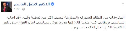 وصف الإعلامي والمذيع السوري بقناة الجزيرة الفضائية القطرية، فيصل القاسم، المفاوضات بين النظام السوري والمعارضة بأنها “تمضية وقت”.
