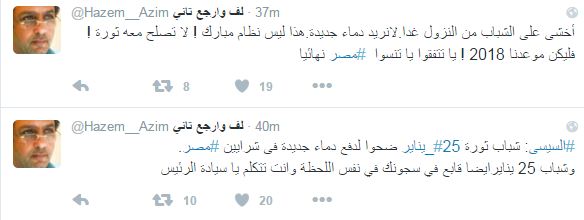 وأعرب “عبدالعظيم” عن خشيته على الشباب من النزول غدا، قائلا: “لا نريد دماء جديدة.. هذا ليس نظام مبارك! لا تصلح معه ثورة!”، وعلق ساخرا: “فليكن موعدنا 2018! يا تتفقوا يا تنسوا #مصر نهائيا”.