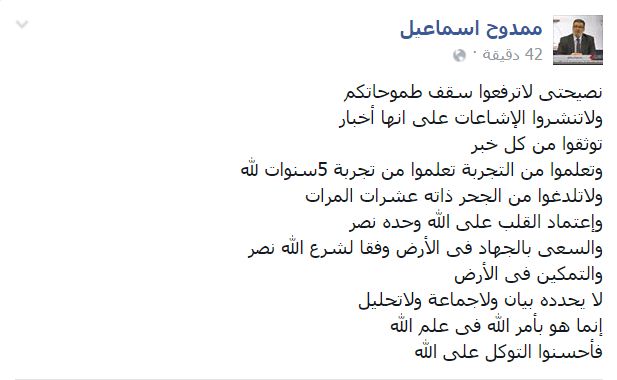 وختم “إسماعيل”: “التمكين في اﻷرض ﻻ يحدده بيان وﻻ جماعة وﻻ تحليل، إنما هو بأمر الله في علم الله، فأحسنوا التوكل على الله”.