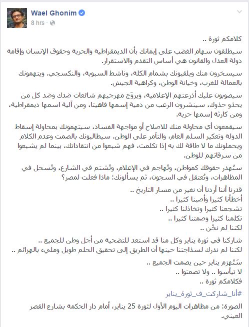نشر الناشط السياسي وائل غنيم، مؤسس صفحة “كلنا خالد سعيد” على الفيس بوك، تعليقا له في الساعات الأولى من ذكرى ثورة الخامس والعشرين من يناير، وذلك من خلال صفحته الرسمية بموقع التواصل الاجتماعي “فيس بوك”.