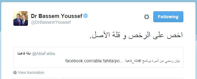 وقال “يوسف” في تغريدته معلقا على بيان “أبلة فاهيتا” بعد أن نشره: “اخص ع الرخص وقلة الأصل”.