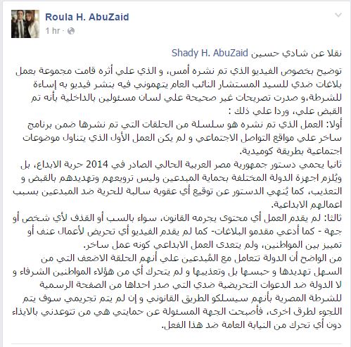 نشرت رولا أبوزيد أخت مراسل برنامج “أبلة فاهيتا” شادي أبوزيد، بيانا خاصا نقلا عنه حول تقديم بلاغ ضده، وذلك عبر صفحتها الشخصية بموقع التواصل الاجتماعي “فيس بوك”.