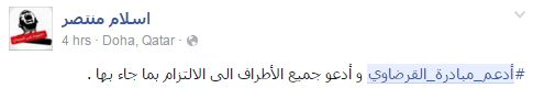 دشن رواد موقع التواصل الاجتماعي “فيس بوك” هاشتاجا تحت اسم “#ادعم_مبادرة_القرضاوي” تأييدًا لمبادرة الدكتور يوسف القرضاوي، رئيس الاتحاد العالمي لعلماء المسلمين، لحل الأزمة الداخلية لجماعة الإخوان المسلمين.