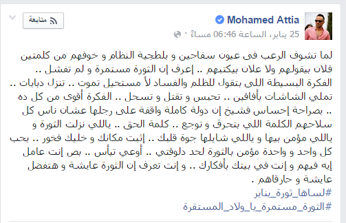عرف الفنان الشاب “محمد عطية” بمواقفه السياسية المعارضة للنظام العسكري في مصر، وتأييده الدائم لثورة 25 يناير، من خلال صفحته الشخصية على “فيس بوك”.