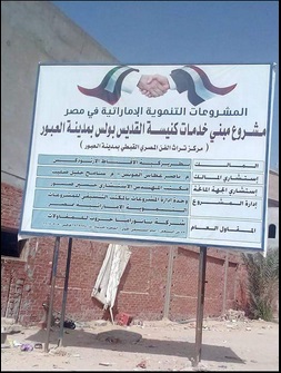 وكان الكاتب الصحفي، جمال سلطان، رئيس تحرير صحيفة “المصريون”، صورة للمشروع الإماراتي للتعمير في مصر، وكتب معلقًا: “أطرف مشروع تنموي إماراتي تقوم به أبوظبي في مصر. مكتوب على “يافطة” المشروع التنموي قيام الإمارات بمشروع مبنى خدمات كنيسة “بولس” بمدينة العبور”.
