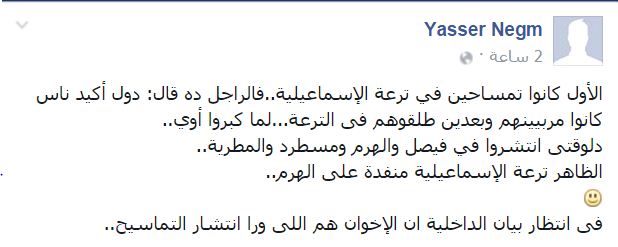 سخر الناشط السياسي، ياسر نجم، من إعلان الحكومة حول ظهور عدة تماسيح في مسطرد وناهيا وفيصل والمطرية بقوله: "في انتظار بيان الداخلية إن الإخوان هم اللي ورا انتشار التماسيح".