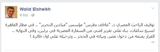 ونشر “الشيخ” تعليقا عبر حسابه الشخصي بموقع التواصل الاجتماعي “فيس بوك”، قائلا: “توقيف الباحث المصري د. عاطف بطرس مؤسس “ميادين التحرير”.. في مطار القاهرة لسبع ساعات، بناء على تقرير أمني من السفارة المصرية في برلين، وفي النهاية.. القرار بمنعه من دخول مصر، وبياته في الحجز.. وترحيله على أول طائرة!”.