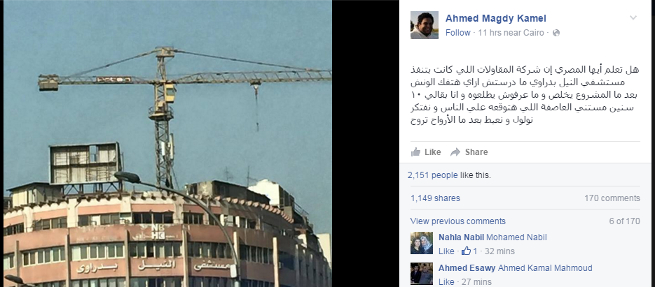تداول رواد موقع التواصل الاجتماعي “فيس بوك” صورة لمستشفى بدراوي النيل بدراوي بالقاهرة، حيث يعتلي مبنى المستشفى، ونش لم تستطع شركة المقاولات التي نفذت المشروع فكه من البمنى، فظهرت تساؤلات عن حقيقة هذة الصورة.