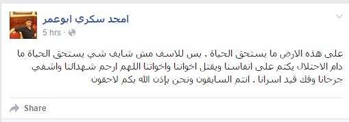 ودعا سكري في منشور يسبقه للشهداء الفلسطينيين بالرحمة وللجرحى بالشفاء، وللأسرى بالحرية قائلًا : ” على هذه الأرض ما يستحق الحياة، بس للأسف مش شايف شي يستحق الحياة ما دام الاحتلال يكتم على أنفاسنا ويقتل اخواننا واخواتنا اللهم ارحم شهدائنا واشفي جرحانا وفك قيد أسرانا، أنتم السابقون ونحن بإذن الله بكم لاحقون”.