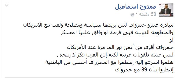وقال- عبر منشور له على “فيسبوك”- “حمزواى أقوى من أيمن نور ألف مرة عند اﻷميركان، ليس عنده تليفونات عربية ،لكنه إبن الغرب.. فكر كارنيجى، هلموا اسرعو إليه اصطفوا مع الحمزواي، أحسن من الباطنية..