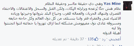 – Yas Mine :” وهي دي حقيقة مااسر وحقيقة النظام ، نظام هش جدًا يُزعجه ويزلزله النِكات، ولكن القتل والسحل والاعتقالات والاختفاء القصري وانتهاك الحريات والعماله للغرب وضياع البلد بثرواتها وخيرتها وزيادة الاغنياء غنى والفقراء فقر واننا بنستلف من كل دول العالم وكل حاجه ضايعه ….”