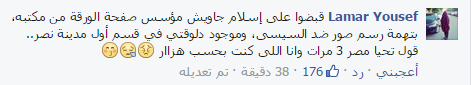 وعقب انتشار خبر الاعتقال ، عبر رواد ” فيس بوك ” عن استيائهم و سخطهم الشديد من اعتقال جاويش ، وجاءت بعض التعليقات كالتالي  :