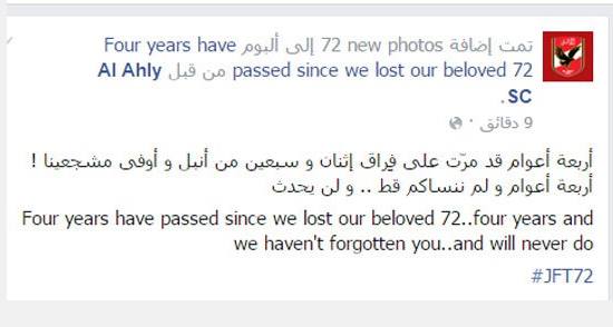 صفحة النادي الأهلي: “أربعة أعوام قد مرّت على فِراق 72 من أنبل وأوفى مشجعينا! أربعة أعوام ولم ننساكم قط.. ولن يحدث”.