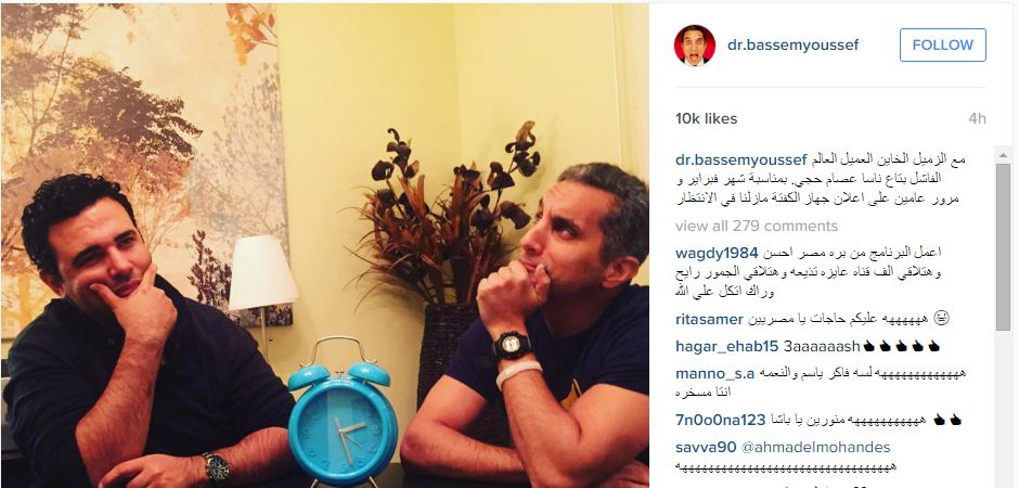 نشر مقدم البرامج الساخر باسم يوسف، صباح اليوم الثلاثاء، عبر حسابه على “انستجرام”، صورة تجمعه مع المستشار العلمي السابق لرئيس الجمهورية، عصام حجي.