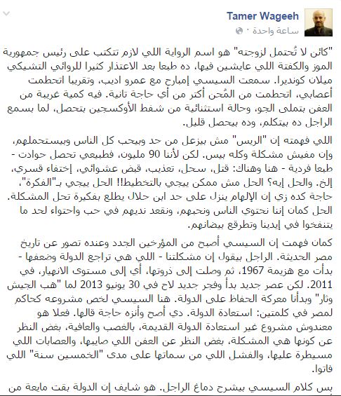 وقال “وجيه” عبر منشور له على “فيس بوك”: “كائن لا تُحتمل لزوجته” هو اسم الرواية اللي لازم تتكتب على رئيس جمهورية الموز والكفتة اللي عايشين فيها، ده طبعا بعد الاعتذار كثيرا للروائي التشيكي ميلان كونديرا، سمعت السيسي إمبارح مع عمرو أديب، وتقريبا اتحطمت أعصابي، اتحطمت من المُحن أكتر من أي حاجة تانية. فيه كمية غريبة من العفن بتملى الجو، وحالة استثنائية من شفط الأوكسجين بتحصل، لما بسمع الراجل ده بيتكلم، وده بيحصل قليل”.