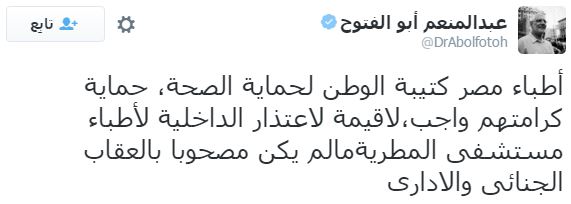 وأوضح أبوالفتوح في تغريدة له عبر حسابه الرسمي على موقع التواصل الاجتماعي “تويتر”، أن أطباء مصر هم كتيبة الوطن لحماية الصحة، مشيرا إلى أن حماية كرامتهم واجبة.