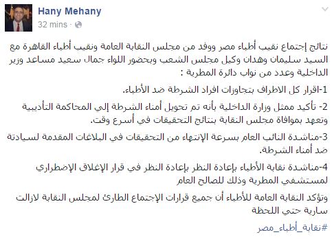 نشر هاني مهنى عضو مجلس نقابة أطباء مصر، نتائج اجتماع نقيب الأطباء ووفد من مجلس النقابة العامة ونقيب أطباء القاهرة مع سليمان وهدان وكيل مجلس الشعب وبحضور اللواء جمال سعيد مساعد وزير الداخلية وعدد من نواب دائرة المطرية، بشأن واقعة اعتداء أمناء شرطة على أطباء بمستشفى المطرية.