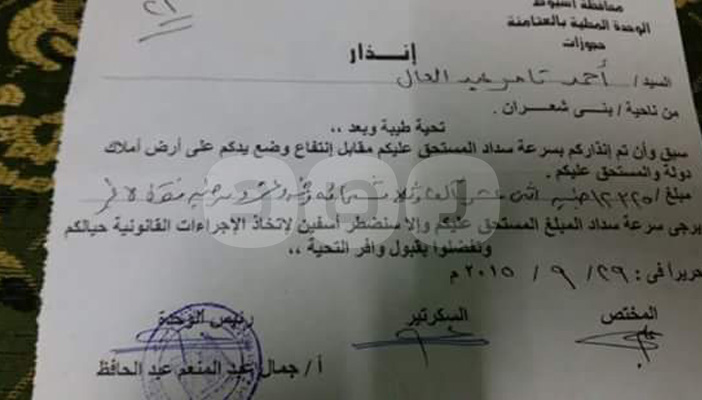 ومن جانبه، يقول أحمد تامر عبدالعال: “وصلني إنذار بدفع مبلغ 15 ألف جنيه قيمة إيجار الأرض المشيد عليه المنزل الذي ورثته عن أبي وجدي منذ الخمسينيات وكنا نسدد الإيجارات بانتظام ولكننا فوجئنا بانتقال أملاك الدولة من الضرائب العقارية للمحليات وقيام المحليات بتثمين سعر إيجار القيراط من 87.5 جنيه للقيراط إلى 12 ألف جنيه”.