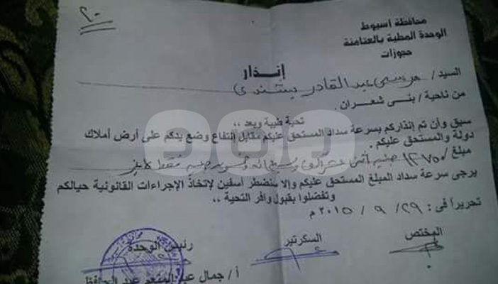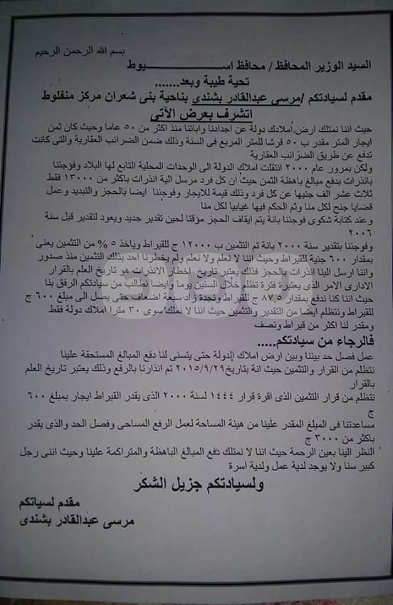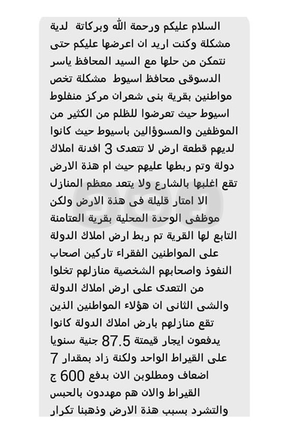 “نتقدم نحن أهالي قرية “بني شعران” التابعة لمركز “منفلوط” محافظة أسيوط، بشكوى عاجلة إلى المهندس “شريف إسماعيل” رئيس الوزراء ومحافظ أسيوط لإنقاذنا من التشريد والسجن المؤكد، نحن نسكن في منازل مشيدة على أرض أملاك دولة ورثناها من آبائنا منذ الخمسينيات، كثر علينا الإيجار بسبب ارتفاع قيمة التسكين من قبل المحليات والتي وصل فيها سعر إيجار القيراط إلى 7 أضعاف ما كان عليه”.